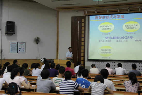 报告会上,郑兰荪院士主要从团簇化学研究进展及团簇化合物的研究和应用两个方面介绍了相关工作的具体情况,对小富勒烯及其内嵌金属簇合物的合成、应用与表征进行了比较和分析,并就其中的实验细节给予了详细讲解。郑兰荪院士的报告高屋建瓴、深入浅出,理论与举例并重,报告中的工作引起学院教师及学生的极大兴趣。报告会后,郑兰荪院士同与会师生进行了交流探讨,对学院教师提出的问题进行了详细解答。