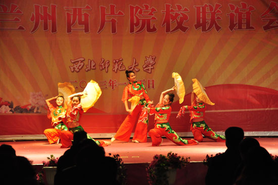 欢快的舞蹈跳起来,美妙的歌声响起来。我校舞蹈学院学生表演的舞蹈《兰花赋》、《少女像花儿一样》,音乐学院师生表演的女声独唱《祝福祖国》、唢呐独奏、手风琴二重奏、京胡独奏,男高音二重唱,兰州城市学院师生的女声独唱、竹笛独奏等精彩演出,把联谊会一次次推向高潮。我校舞蹈学院表演的舞蹈《鼓舞太平》,以其恢宏的气势和美好的祝福将联谊会推向了巅峰并拉下了帷幕。