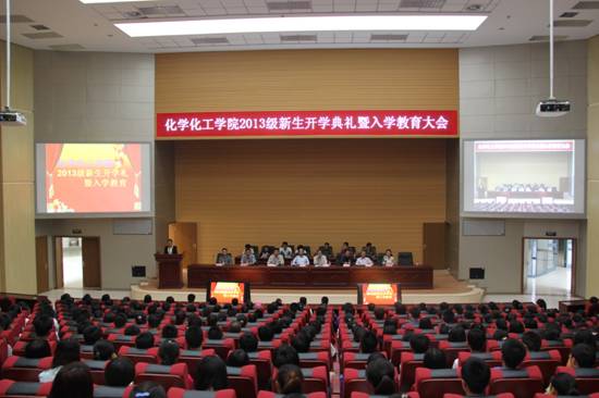 2013年9月6日,化学化工学院在新校区毅然报告厅隆重举行了2013级新生开学典礼暨入学教育大会。学院全体领导、辅导员老师、新生班主任和全体本科生、研究生共计469人参加了大会,孟汇海副书记主持了大会。