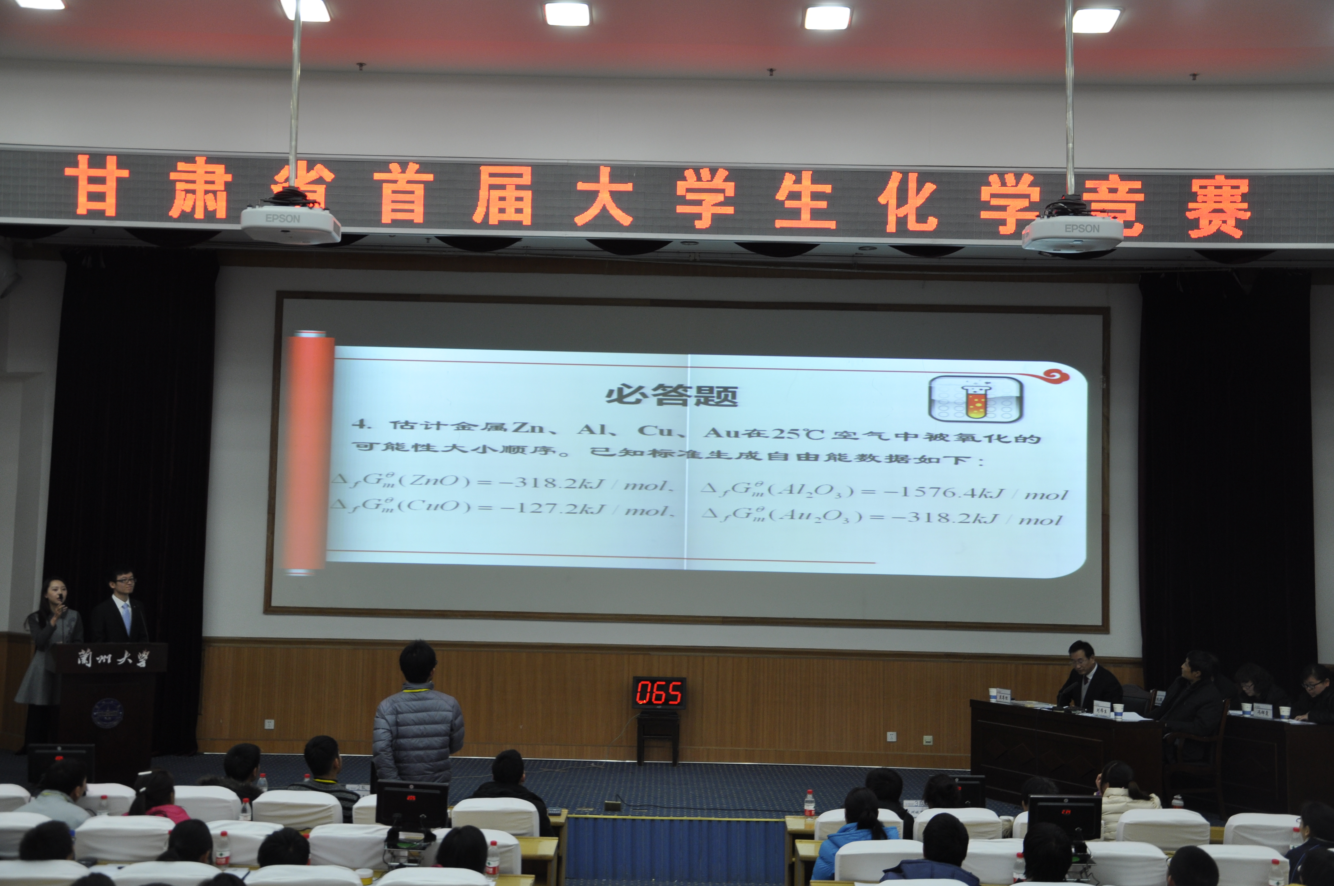 为促进化学教育教学新思想与新方法的交流,普及化学基础知识,激励大学生接触化学发展的前沿,培养大学生学习化学的兴趣爱好、创新意识、创新思维和创新能力,由甘肃省化学会主办,兰州大学承办的甘肃省首届化学竞赛于12月28-29日在兰州大学举行。