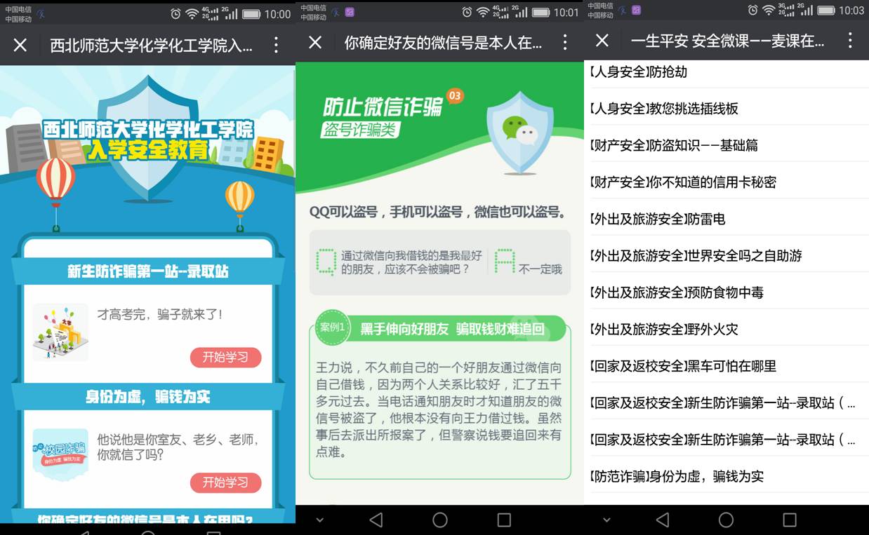 9月1日,365上市公司官网微信平台正式开通《“互联网+”大学生安全教育》课程,进行安全教育前置。通过将安全教育课程植入移动微端,通过手机、电脑、平板等多种平台进行学习。微课采用了视频、动画、图文、游戏交互、案例讲解等多种形式,用轻松的语言讲授最实用的安全常识、求生技能,能够促进学习者主动学习,丰富学习者的安全知识,强调安全问题并提高学习者的安全意识。