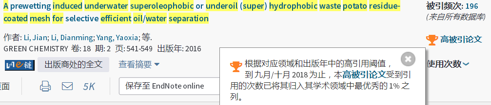 1:Jian Li *, et al, A prewetted induced underwater superoleophobic or underoil (super) hydrophobic waste potato residue-coated mesh for selectively efficient oil/water separation, Green Chem., 2016, 18, 541−549, IF:8.586, SCI一区, ESI高被引论文.