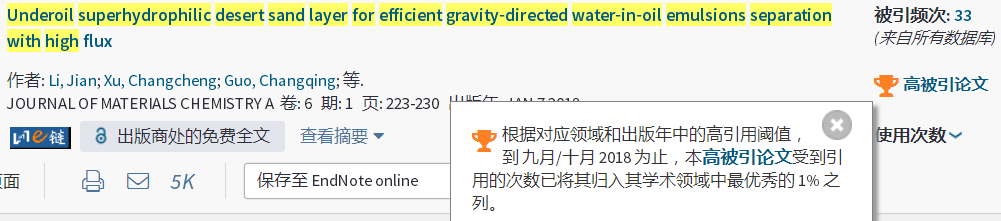 4:Jian Li *, et al, Underoil superhydrophilic desert sand layer for efficient gravity-directed water-in-oil emulsions separation with high flux, J. Mater. Chem. A, 2018, 6, 223–230, IF:9.931, SCI一区, ESI高被引论文.