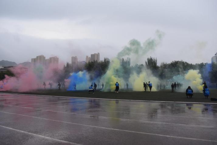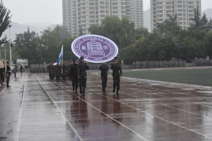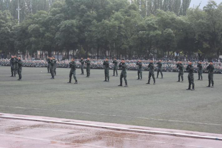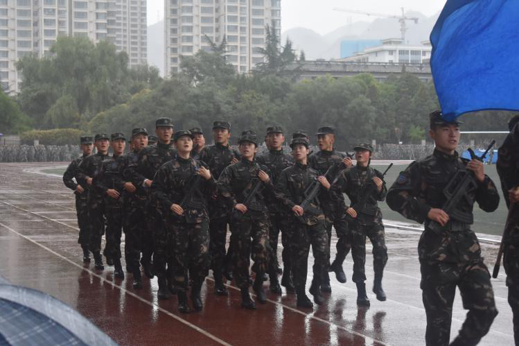 由化学化工学院与生命科学学院、旅游学院组成的600人方队迈着铿锵的步伐入场,他们用手中的红板拼出对祖国、对学校的热爱,一句满怀气势的“知术欲圆,行旨须直”喊出了师大学子拼搏向上、积极进取的精神风貌。雨水打湿了帽檐,淋湿了迷彩,模糊了天空,但也打湿不了那颗坚定热血的心。