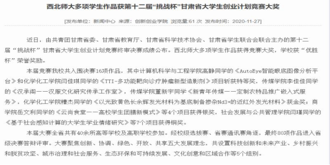 近日,第十二届“挑战杯”甘肃省大学生创业计划竞赛终审决赛成绩公布,365上市公司官网多项学生作品获奖。
