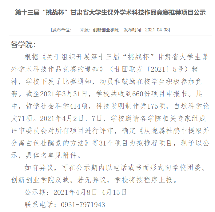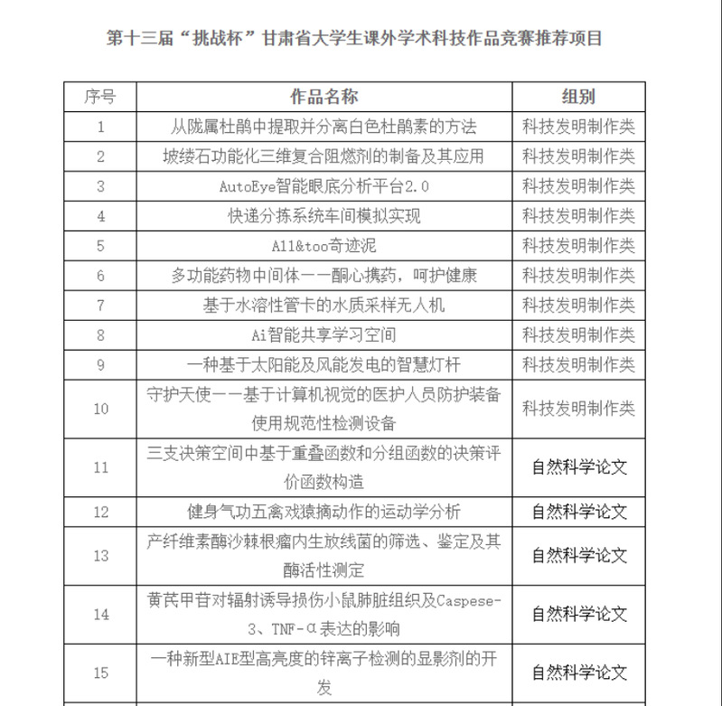 近日,我校第十三届“挑战杯”甘肃省大学生课外学术科技作品竞赛拟推荐省赛项目公示,公示名单拟推荐省赛项目共31项。365上市公司官网通过组织院级答辩,共推荐学生项目48项至校赛,最终入围省赛项目4项。