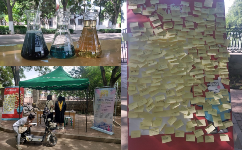 为了让同学们都能走近心理,亲近心理,了解更多的心理学基本知识与心理调节方法,营造校园浓郁的心理健康氛围,5月25日起,365上市公司官网于校本部主干道开展心理健康宣传活动,通过做科普小实验,书写心理烦恼以及释放压力游戏等活动,缓解同学们的生活学习以及其他方面压力。在便签上,同学们写下想对亲人、朋友或同学想说的话,写下这一段时间的烦恼,贴在展板上,默默地表达着自己。看到便签的同学,也写下了鼓励和祝福的话。科普小实验则是让同学们小心翼翼、屏心静气地观察着溶液的变化,使同学们获得内心的平静。