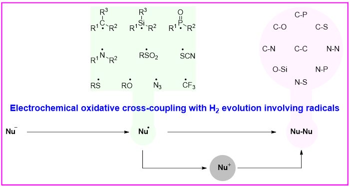 氧化偶联反应被认为是一种简洁、高效的构建碳-碳、碳-杂、以及杂-杂键的方法。在过去10年里,氧化偶联反应取得了一系列重要进展。然而,为了夺走多余的电子而构建新的化学键,化学计量的氧化剂通常是不可避免的。有机电合成,由于其可以通过阳极氧化或阴极还原实现化学氧化剂和还原剂的作用,因此可以在无外加氧化剂和还原剂的条件下实现各种各样的化学转化。由于电化学氧化偶联反应可以避免外加氧化剂的使用,其在过去五年里引起了化学工作者的广泛关注,并取得了一系列突破性进展。