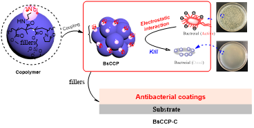 首先,开展了特殊形貌阳离子聚合物Janus微球的合成及其在高效抗菌涂料的应用。以常见的丙烯酸酯类单体、苯乙烯单体及阳离子单体,水为溶剂,采用一锅无皂乳液聚合法,精确控制合成工艺与条件(表面活性剂、引发剂、温度、单体比例等因素),成功合成了具有广谱抗菌活性的黑莓形阳离子共聚物颗粒(BsCCP),并将BsCCP乳液加入到内墙涂层中,得到了BsCCP基涂料(BsCCP-C)(Scheme 1)。评价了其对大肠杆菌和金黄色葡萄球菌的抗菌活性,讨论了其抗菌机制。发现BsCCP具有高效的抗菌活性,有望成为一种能够快速有效抵抗细菌繁殖的抗菌涂层材料。该成果以论文“Preparation of blackberry-shape cationic copolymer particles for highly effective antibacterial coatings”发表在Colloids and Surfaces A: Physicochemical and Engineering Aspects, 2021, 614, 126202.(化学2区,IF:4.53);另一篇论文“Synthesis of cationic acrylate copolyvidone-iodine nanoparticles with double active centers and their antibacterial application”发表在Nanoscale, 2020, 12, 21940-21950(工程I区,IF:7.79)。第一作者为李雪梅(硕士研究生)。