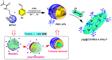 其次,进行了蠕虫状共聚物Janus微球的合成及高效抗菌活性复合材料的制备。采用悬浮聚合和界面聚合相结合的方式,亲水性的阳离子型丙烯酸酯(MaC)和疏水性的苯乙烯(St)为聚合单体,甲苯为合成Janus微球的软模板剂,成功合成了具有高效抗菌活性的蠕虫状共聚物Janus微球(PMS-WJMs)。然后将PMS-WJMs与银负载壳聚糖(Ag@CS)结合,制备了无机纳米微粒负载天然高分子/合成高分子(Ag@CS /PMS-WJMs)复合材料(Scheme 2),目的是作为一种新型的双活性抗菌材料,用于抑制细菌的感染和繁殖。考察了合成材料的抗菌活性,发现合成的PMS-WJMs和Ag@CS/PMS-WJMs对典型的大肠杆菌和金黄色葡萄球菌显示出良好的抗菌活性。制备的PMS-WJMs和Ag@CS/PMS-WJMs能被用作抑制细菌感染和繁殖的新型抗菌材料,抗菌蠕虫状聚合物颗粒在新型界面材料的制中具有重要的意义。该成果以论文“Synthesis of Ag@chitosan/copolymer with dual-active centers for high antibacterial activity”发表在International Journal of Biological Macromolecules, 2021, 174: 198-206(高分子科学1区,IF:6.95),第一作者为王斌(博士研究生)。另一篇论文“Antimicrobial Cationic Acrylate-based Hybrid Coatings against Microorganism Contamination”发表在Progress in Organic Coatings, 2020, 142: 105576(材料科学I区,IF:5.16)。王发伟(硕士研究生)和王斌(博士研究生)为共同第一作者。