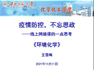 为交流总结近期线上教学工作,11月11日下午,化学化工学院举行线上交流讨论会议,就线上教学中遇到的问题和困难、解决办法及教学中形成的经验进行了交流总结。学院党委书记赵辉、院长权正军、副院长宋鹏飞、薛中华、各系主任、教研组负责人和全院教学老师参加了此次交流讨论会。