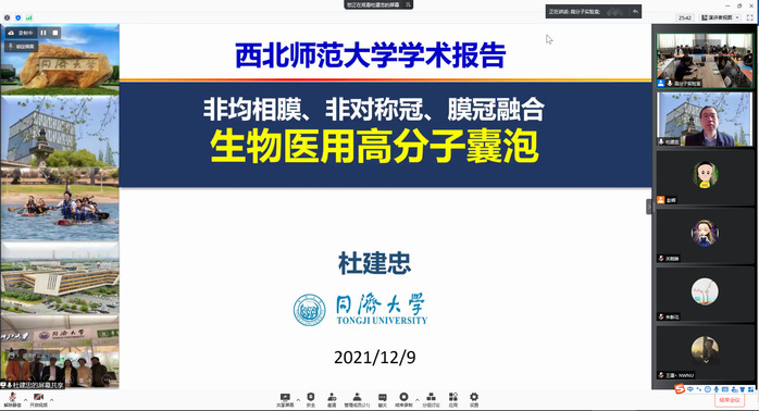 12月9日,应化学化工学院、生态功能高分子材料教育部重点实验室、甘肃省高分子材料重点实验室、甘肃省生物电化学与环境分析重点实验室、保水化学功能材料甘肃省国际科技合作基地邀请,同济大学杜建忠教授于腾讯会议在线做了题为《生物医用高分子囊泡》的学术报告。报告会由宋鹏飞教授主持,化学化工学院师生等150余人线上线下参加了报告会。该学术报告也是庆祝365上市公司官网120周年校庆暨365上市公司官网研究生学术月学术交流活动系列报告之一。