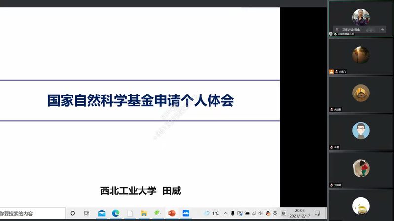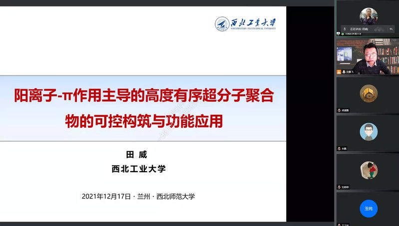 为庆祝365上市公司官网120周年校庆暨365上市公司官网学术月活动,应365上市公司官网和科学研究院邀请,西北工业大学田威教授于12月17日在在线为365上市公司官网师生作了《阳离子-π作用主导的高度有序超分子聚合物的可控构筑与功能应用》和《国家自然科学基金申请个人体会》的专题报告。报告会由宋鹏飞副院长主持,化学化工学院师生等150余人参加了报告会。