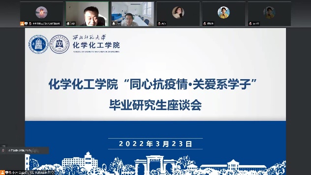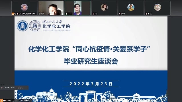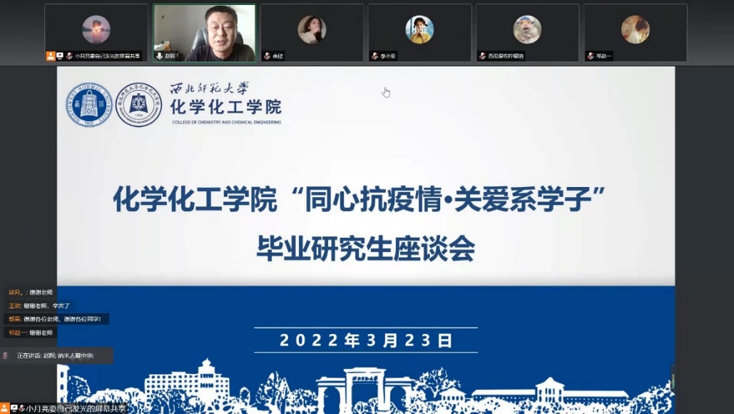 最后,赵辉书记就本次座谈会做总结,他表达了在这一特殊时期,学院对全体毕业生的深切关怀,并对教育厅及学校疫情防控的有关规定措施想各位毕业生做了解答,希望各位毕业生面对各项挑战,积极、沉着应对,圆满完成研究生阶段的学习、就业等相关工作。