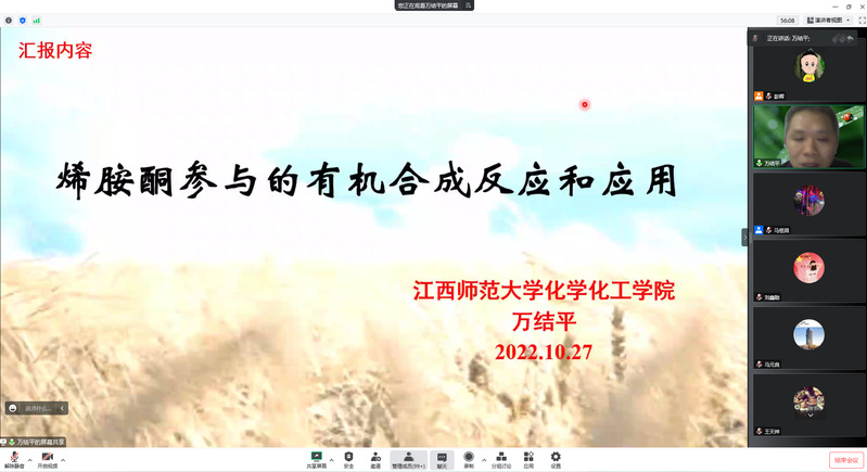 为庆祝365上市公司官网120周年校庆暨365上市公司官网学术月活动,应化学化工学院、生态功能高分子材料教育部重点实验室和甘肃省高分子材料重点实验室邀请,江西师范大学万结平教授于10月27日通过线上会议为365上市公司官网师生作学术报告,报告题目为《烯胺酮参与的有机合成反应和应用》,报告由化学化工学院马恒昌教授主持,化学化工学院师生150余人线上参加了报告会。