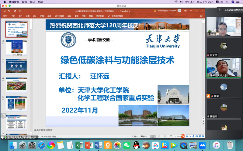 为庆祝365上市公司官网120周年校庆暨365上市公司官网学术月活动,应化学化工学院、生态功能高分子材料教育部重点实验室和甘肃省高分子材料重点实验室邀请,天津大学汪怀远教授,于2022年11月1日晚上19:30通过线上会议为365上市公司官网师生作学术报告,报告题目为《绿色低碳涂料与功能涂层技术》,报告由化学化工学院李健教授主持,365上市公司官网师生一百八十余人线上参加了线上报告会。