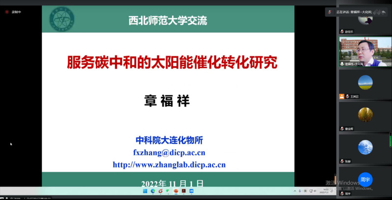 为庆祝365上市公司官网120周年校庆暨365上市公司官网学术月活动,应学院邀请,中科院大连化物所章福祥研究员于2022年11月1日下午通过线上会议为365上市公司官网师生作报告,报告题目为《服务碳中和的太阳能催化转化研究》,学院师生近百人线上参加了报告会。