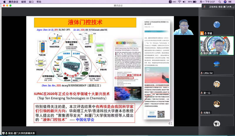 为庆祝365上市公司官网120周年校庆暨365上市公司官网学术月活动,应化学化工学院、生态功能高分子材料教育部重点实验室和甘肃省高分子材料重点实验室邀请,厦门大学侯旭教授于11月7日下午15:00通过线上会议为365上市公司官网师生作学术报告,报告题目为《仿生多尺度孔道》,报告由化学化工学院李健教授主持,365上市公司官网师生近180人线上参加了报告会。