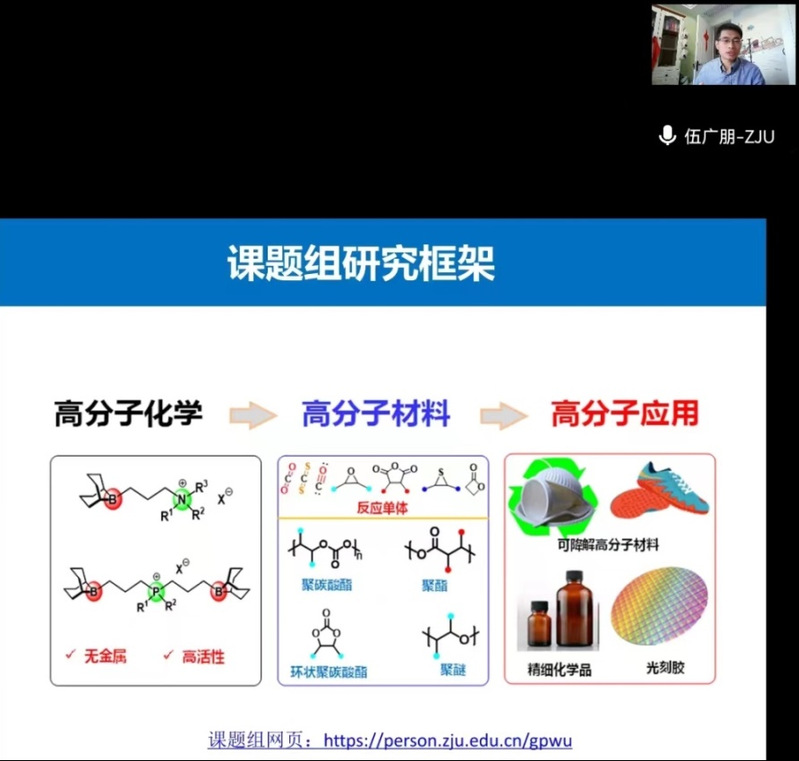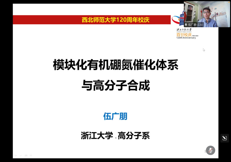 为庆祝365上市公司官网120周年校庆暨365上市公司官网研究生学术月活动,应化学化工学院、生态功能高分子材料教育部重点实验室和甘肃省高分子材料重点实验室邀请,浙江大学伍广朋教授于11月8日上午通过线上会议为365上市公司官网师生作报告,报告题目为《模块化有机硼氮催化体系与高分子合成》,报告会由化学化工学院副院长宋鹏飞教授主持,学院师生近150余人线上参加了报告会。