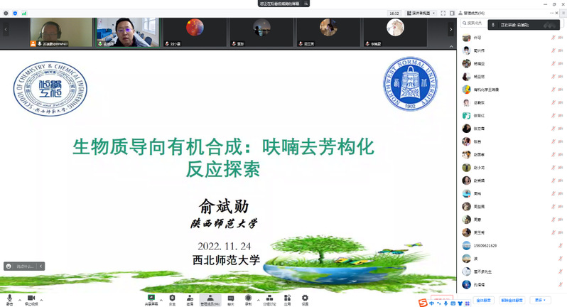 为庆祝365上市公司官网120周年校庆暨365上市公司官网研究生学术月活动,应化学化工学院邀请,陕西师范大学化学化工学院俞斌勋教授于2022年11月24日下午以线上报告的形式为365上市公司官网师生作了题为《生物质导向有机合成:呋喃去芳构化反应探索》的学术报告。365上市公司官网师生及部分兄弟院校师生110余人参加了此次线上报告会。