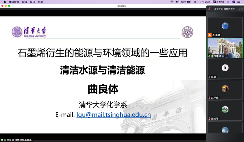 为庆祝365上市公司官网120周年校庆暨365上市公司官网研究生学术月活动,应化学化工学院、生态功能高分子材料教育部重点实验室和甘肃省高分子材料重点实验室邀请,清华大学曲良体教授于11月28日下午14:30通过线上会议为365上市公司官网师生作学术报告,报告题目为《石墨烯衍生的能源与环境领域的一些应用》,报告由化学化工学院李健教授主持,学院师生130余人线上参加了报告会。