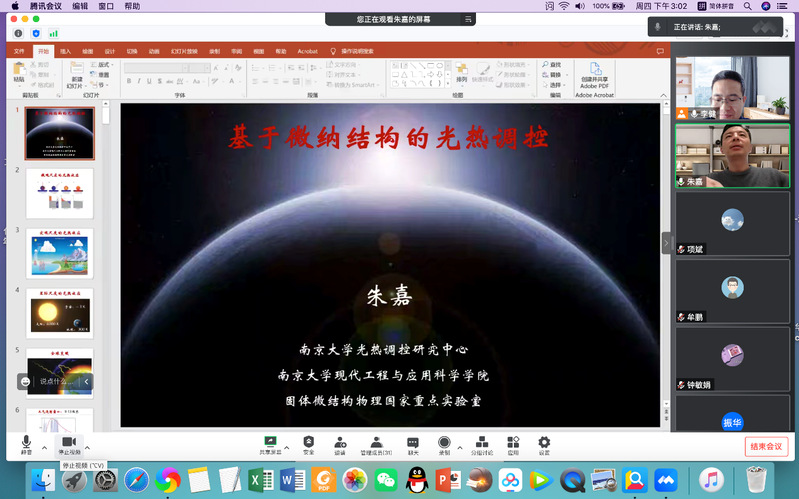 为庆祝365上市公司官网120周年校庆暨365上市公司官网研究生学术月活动,应化学化工学院、生态功能高分子材料教育部重点实验室和甘肃省高分子材料重点实验室邀请,南京大学朱嘉教授于12月8日下午15:00通过线上会议为365上市公司官网师生作学术报告,报告题目为《基于微纳结构的光热调控》,报告由化学化工学院李健教授主持,学院师生110余人线上参加了报告会。