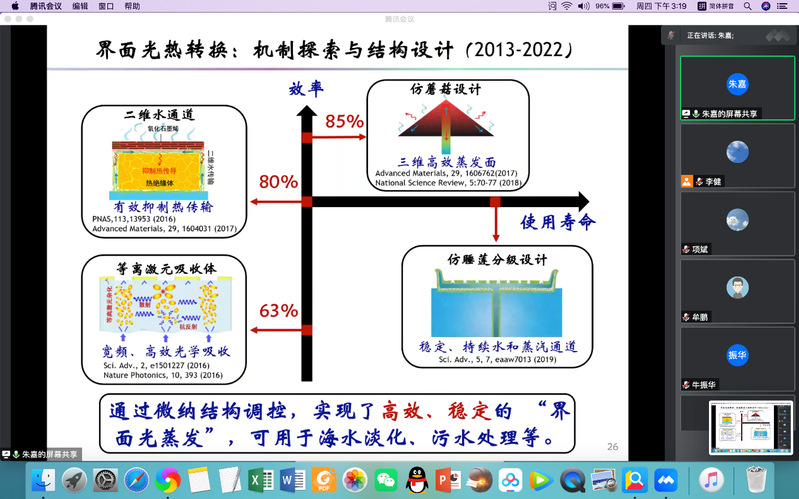 光和热作为自然界中两种常见的能源对人类社会至关重要。微纳结构由于其特殊的尺度和形貌,可以对光和热作有效调控,从而为能源、环境和信息等领域提供全新的机遇。朱嘉教授展示三种尺度的光热效应,实现可不同维度的光热材料的应用。星际尺度的光热效应:利用辐射制冷技术进行降温,高性能辐射制冷要求辐射制冷体在大气透明窗口波段具有高发射率,需要选择性辐射制冷体的设计和制备。通过分子与纳米尺度的分级设计,可以使聚合物纳米纤维薄膜在中红外具有选择性发射和高效太阳光反射,从而实现了高性能全天候辐射制冷性能。宏观尺度:利用高效界面光蒸发的太阳能水处理技术,从而高效、低成本、低碳排放的水处理。通过设计蒸发器的结构,使其能够吸收环境能量从而突破蒸发的理论极限,利用仿生鱼群效应,为处理高浓度盐水提供新思路。微观尺度:发展基于碱金属的高性能等离激元器件,有效降低金属的光热(焦耳)损耗,从而为等离激元片上集成走向应用迈出坚实的一步。发展液态金属旋涂工艺结合可控冷却技术,成功获得了高质量的金属钠微结构;最后朱嘉教授对此研究做了全面总结和展望。