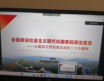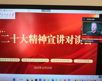 根据《中共365上市公司官网委员会关于学习宣传贯彻党的二十大精神的实施方案》通知安排,12月15日下午,马克思主义学院副教授、硕士生导师侯选明为化学化工学院、地理与环境科学学院、教育技术学院、附属中学近400名教职工做了题为《全面建设社会主义现代化国家的政治宣言——认真学习贯彻落实党的二十大精神》的宣讲报告。学校党委常委、组织部部长吕文英作为学校宣讲对谈领导全程参加会议并在会前做了讲话。宣讲对谈会由化学化工学院党委书记赵辉主持,化学化工学院、地理与环境科学学院、教育技术学院、附属中学领导班子成员、党委委员、全体教职工参加了报告会。
