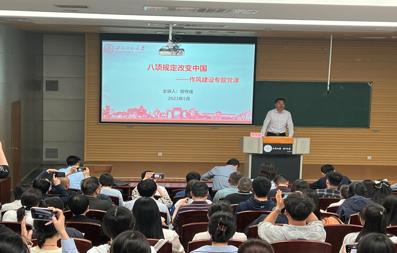 专题廉政党课由中国共产党历来重视作风建设、八项规定改变中国、学校严格落实中央八项规定及其细则精神和作风建设永远在路上四部分组成。党课由中国共产党作风建设历史沿革谈起,分别讲述了新民主主义革命时期、社会主义革命和建设时期、改革开放和社会主义现代化建设时期和新时期党的作风建设的内容和意义;党课注重理论与典型案例相结合,重温了八项规定精神和具体内容,重点讲述了自2017年10月27日八项规定出台以来,党风政风和社会风气为之一新的新时代新面貌;祁守成同志还结合实际,全面梳理了学校在落实中央八项规定及其细则精神的主要措施和做法,确保八项规定落实落细落地。