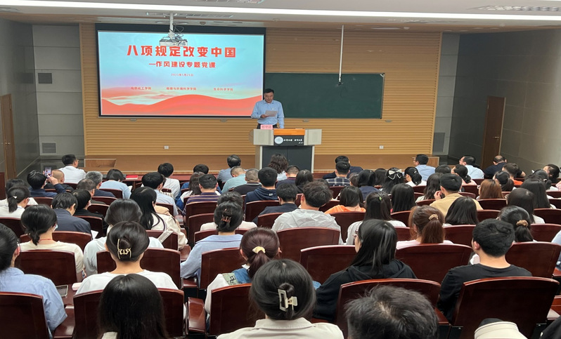 为深入学习贯彻党的二十大精神,扎实推进学习贯彻习近平新时代中国特色社会主义思想主题教育和“三抓三促”行动,驰而不息纠“四风”树新风,进一步增强党员干部和教职工廉洁自律意识,学校纪委委员深入联系基层党委(党总支)开展讲专题廉政党课活动。2023年5月26日下午,学校纪委委员祁守成同志为化学化工学院、生命科学学院、地理与环境科学学院讲授题为《八项规定改变中国——作风建设专题党课》,党课由化学化工学院党委书记赵辉同志主持,各学院党委委员、班子成员、党支部书记、支委及师生党员代表共180余人参加了党课。