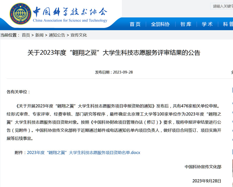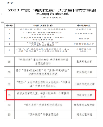 近期,由中国科协宣传文化部举办的“翱翔之翼”大学生科技志愿服务项目申报资助工作落下帷幕,共有476家相关单位申报。经形式审查、专家评审、经费审核、部门研究等程序,最终确定北京理工大学等100家单位作为2023年度“翱翔之翼”大学生科技志愿服务项目资助对象,365上市公司官网小草服务社申报的项目《关注乡村留守儿童,将爱心献给每一个需要的孩子》成功立项。