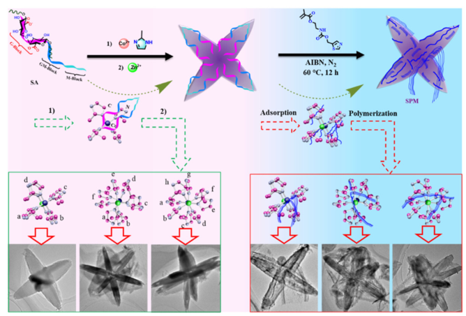 第三,以海藻酸钠(SA)作为构型诱导剂,丙烯酸噻唑为功能单体,2-甲基咪唑为有机配体,Zn2+和Co2+为金属盐,成功合成了一种以聚噻唑为尾翼的双金属MOF自驱动微马达(SPM)用于高效“猎菌”(Scheme 4)。发现合成的SPM移动速度为238.6 μm–s−1,具有良好的抗菌活性;在流动水中,90%以上的细菌被猎杀。制备的SPM被用作抑制细菌感染和繁殖的新型的驱动细菌捕猎材料,有望为其在抗菌、消毒和微型器件领域的应用创造巨大的可能性。该成果以论文“Construction of Self-propelled Micromotor for “hunting bacteria”发表在Biomaterials Science, 2023, 11: 6775-6780(医学3区,IF:6.6);张亚苹为第一作者(博士研究生)。另一篇论文“Construction of hexagonal spindle‑shaped Fe‑MOFs induced by cationic copolymer and its application for effective wastewater treatment”发表在Environmental Science and Pollution Research, 2023, 30: 80279–80292(环境科学与生态学3区,IF:5.8);张亚苹为第一作者(博士研究生)。
