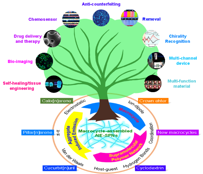 该综述首先阐述了各类大环化合物包括冠醚、环糊精、杯芳烃、葫芦脲、柱芳烃以及其它新型大环化合物)的结构特点、空腔尺寸以及其所提供的独特的非共价相互作用类型和超分子组装方式。其次,该综述系统介绍了各种聚集诱导发光的机理。在此基础上,该综述以不同的大环分类,系统介绍了基于大环的聚集诱导发光超分子聚合物网络的构建、结构特点、发光性能和应用性能。该综述指出,将大环聚集诱导发光的概念引入到超分子聚合物网络的设计中,实现了集大环、聚集诱导发光和超分子聚合物网络的优势于一体,既提高了超分子聚合物网络的光学性能和主客体选择性,也拓宽和丰富聚集诱导发光和大环化合物的应用性能。所得的材料在检测分离、手性识别与分离、生物成像、圆偏振发光光学防伪、药物输送与治疗组织工程等领域具有良好的应用前景。该综述还对当前研究中所面临的挑战与机遇进行了全面的总结和展望