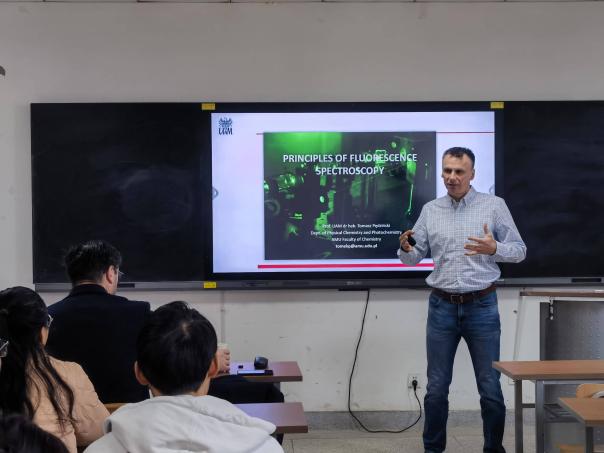 Tomasz Pędziński教授在激光光谱(时间分辨),光化学,光敏/光催化反应,化学成像,单线态氧动力学,自由基过程领域具有深厚的学术造诣。在这次报告中,Tomasz Pędziński教授作了题为“Laser spectroscopy (time-resolved)”、“Photochemistry”、“Photosensitized reactions”、“Photooxidation of peptides/proteins” 和 “Singlet oxygen dynamics” 的报告。全面地介绍了激光光谱学和荧光光谱的基本概念,并且深入探讨了荧光光谱在化学成像和荧光材料研究中的独特应用。他的讲解不仅让我们对光谱学有了更深入的理解,同时也启发了师生对荧光光谱研究的新思路。