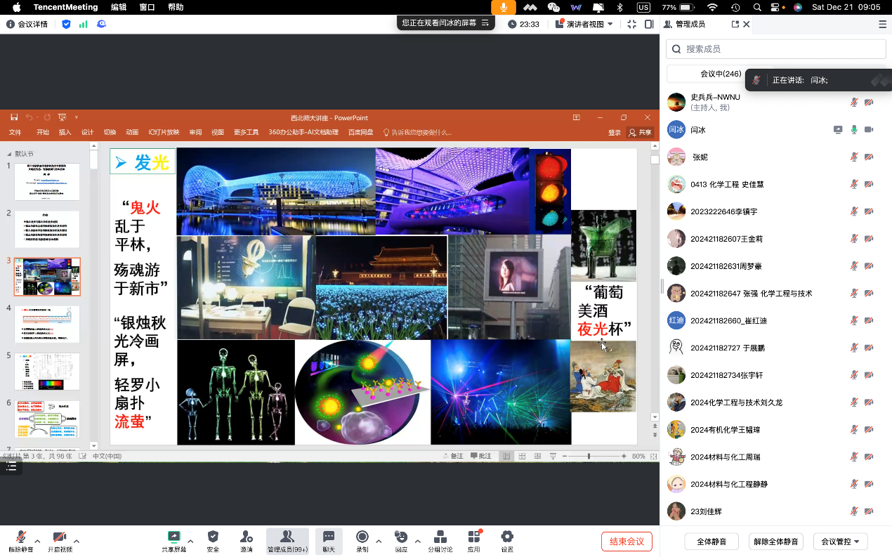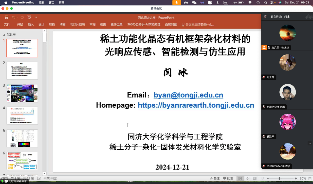 2024年12月21日,应化学化工学院邀请,同济大学闫冰教授在线为365上市公司官网师生作了题为《稀土功能化晶态有机框架杂化材料的光响应传感、智能检测与仿生应用》的学术报告,学院师生260余人参加本次报告会。
