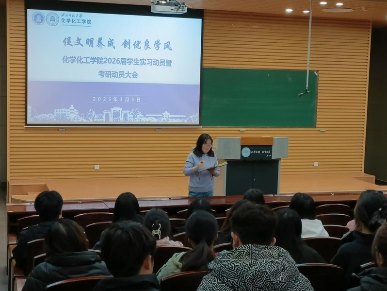 为确保2026届毕业生实习工作顺利进行,并在实习期间对职业生涯和个人发展明确目标、做好规划,3月5日下午,化学化工学院在毅然报告二厅召开“促文明养成,创优良学风”系列活动之2026届实习动员大会暨考研动员大会。全体2026届本科生参会学习。