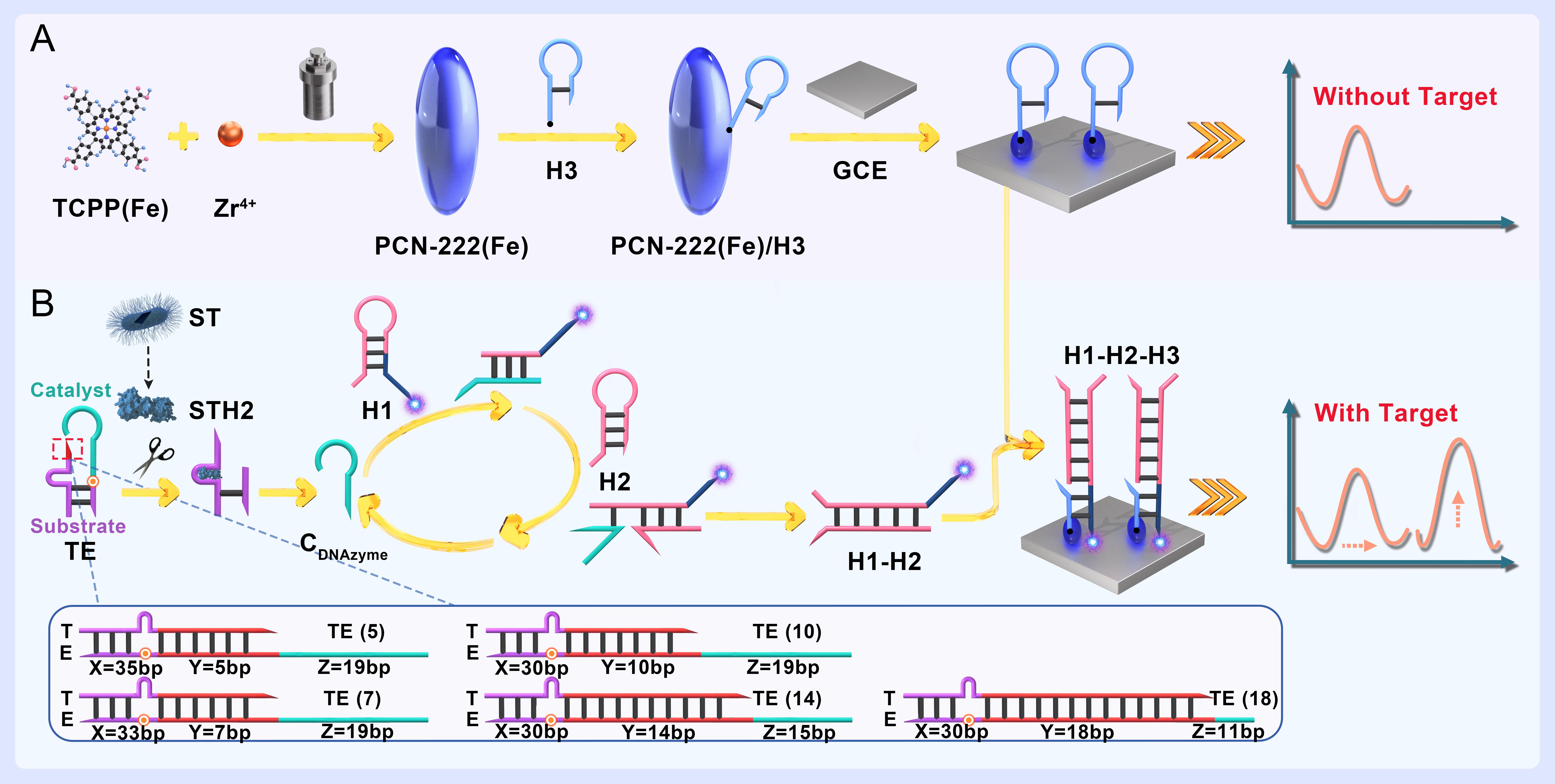 图1.检测鼠伤寒沙门氏菌的比率型电化学传感器的构建示意图及工作原理