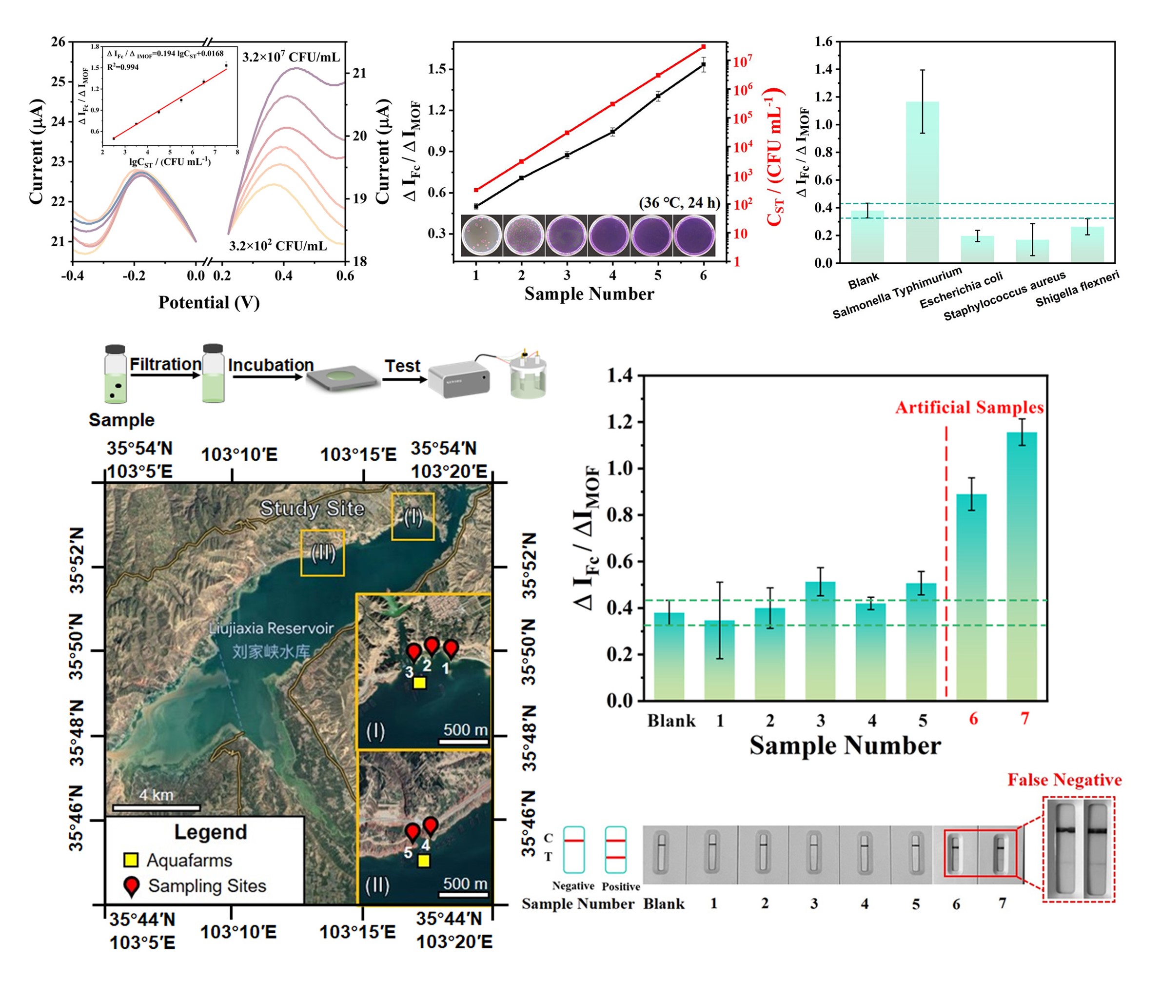 水中生物性污染已成为环境安全和人类健康的重要威胁。沙门氏菌作为一种常见的食源性、水源性致病菌,可通过污染环境水体引发群体性感染,严重威胁公共健康安全。传统检测方法依然存在诸多局限,如细菌培养法耗时长、PCR技术依赖复杂仪器及专业操作,难以满足沙门氏菌的快速、灵敏、现场分析需求。因此,急需开发一种灵敏、快速的方法来特异性检测水中的沙门氏菌。近日,卢小泉、祝振童团队报道了一种新型无酶扩增比率电化学生物传感平台,用于灵敏、快速、现场定量检测城市水源中的鼠伤寒沙门氏菌。该方法通过DNAzyme选择性识别诱导引发,结合下游催化发夹DNA组装(CHA)的目标特异性组装扩增,使传感器对活体鼠伤寒沙门氏菌在3.2×102-3.2×107 CFU/mL范围内表现出良好的线性关系,检测限为489 CFU/mL。该传感器对于检测沙门氏菌具有良好的选择性和重现性,对于不同pH、离子强度特点的环境水体均保持较好的稳定性。最后,作者将构建的传感器应用于城市上游水源地刘家峡库区和黄河兰州段流域中沙门氏菌的实际水样检测,结果不仅与金标准细菌培养法相一致,而且表现出比商用试纸条更高的灵敏度,证明了该基于功能核酸自组装的无细胞生物传感体系的可行性和应用潜力。