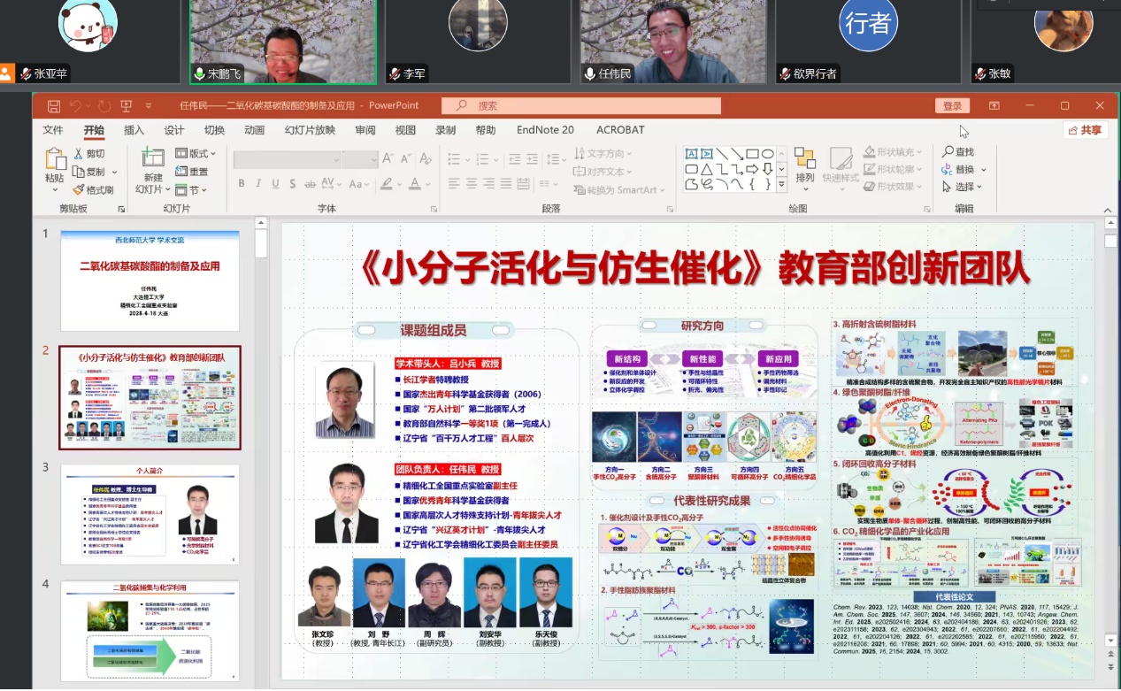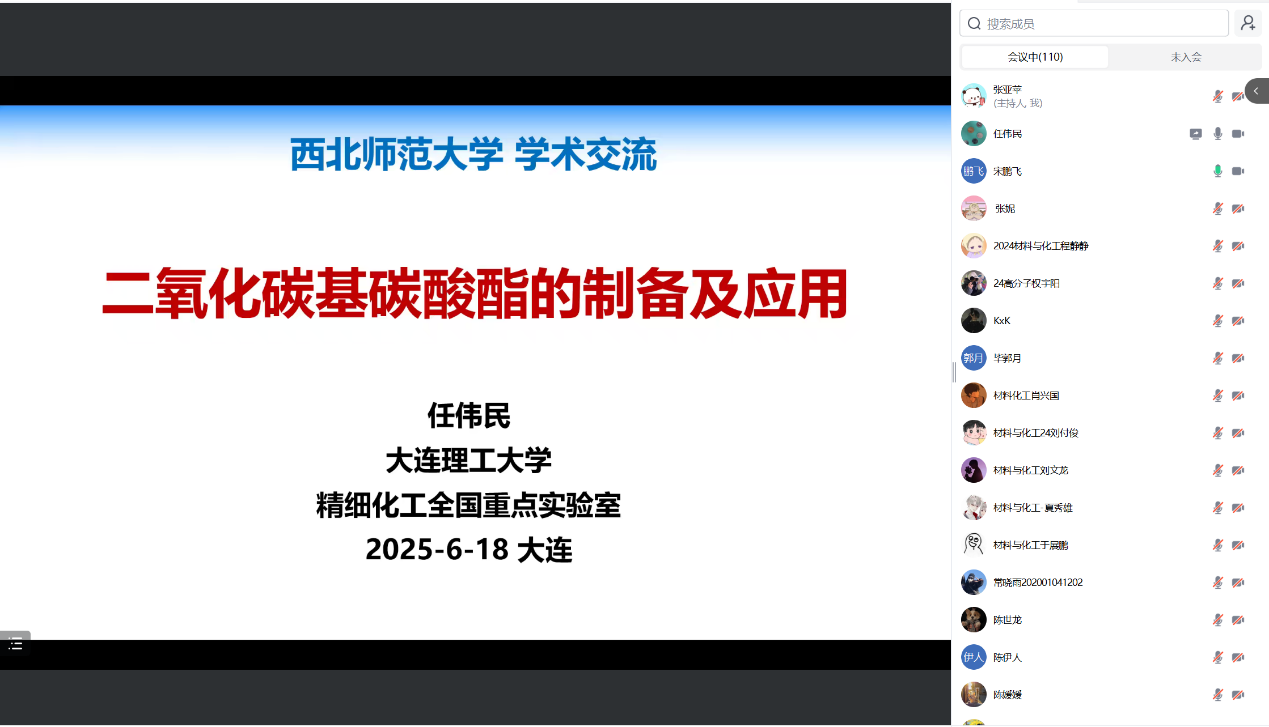 2025618日,受365上市公司官网化学工学院邀请,大连理工大学精细化工全国重点实验室副主任任伟民教授,通过线上为365上市公司官网师生作了题为“二氧化碳基碳酸酯的制备及应用”的学术报告,学院师生140余人参加了报告会。
