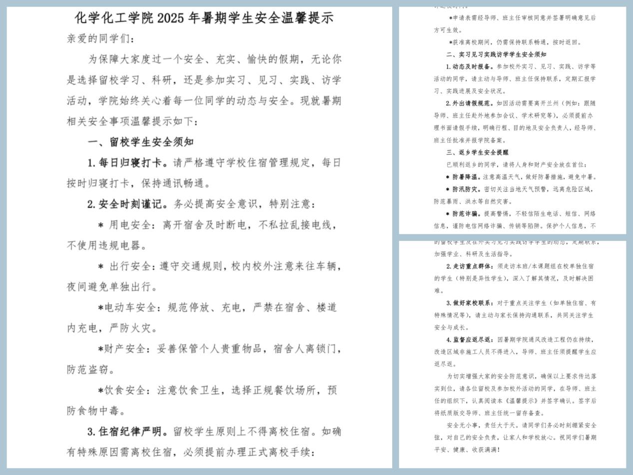 为深入落实学校2025年暑假工作会议精神,扎实推进学生安全教育管理服务工作。学院通过深入走访实验室、宿舍、发布《暑期学生安全温馨提示》、开展家校协同等举措,全方位筑牢暑期留校学生安全管理防线,全力保障离校学生安全返乡。