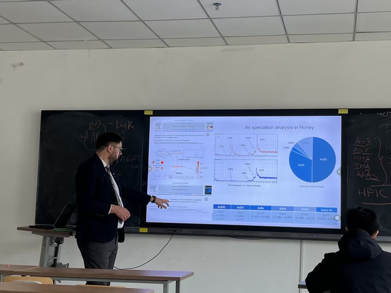 两位教授围绕分析化学关键技术与实际应用展开系统分享,内容兼具理论深度与实践指导价值,涵盖光谱学、色谱学、联用技术等领域。Marcin Frankowski教授(波兹南大学分析与环境化学系主任,仪器分析与环境分析领域杰出学者)以光谱学技术为核心,先后作了“Introduction to Analytical Chemistry” “Fundamentals of Spectrometry part I (ICP-OES)”“Fundamentals of Spectrometry part II (ICP-MS)”“Application of ICP-OES and ICP-MS in routine analysis”“Hyphenated techniques in environmental and food analysis, method development and application”5场讲座。他系统阐述了ICP-OES/ICP-MS的原理框架,结合环境污染物检测、食品成分分析的实际案例,解析技术应用逻辑,让师生对高端仪器分析技术有了更直观的认知。